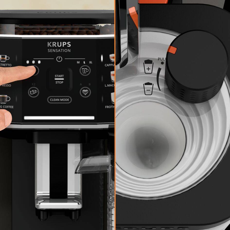 Geniet van het juiste kopje voor elke soort koffiedrank. Je hoeft niet te kiezen tussen kleine of grote kopjes, KRUPS Sensation Milk biedt de flexibiliteit om elk formaat kopje te gebruiken, van een klein espressokopje tot een grote mok voor latte macchiato.
